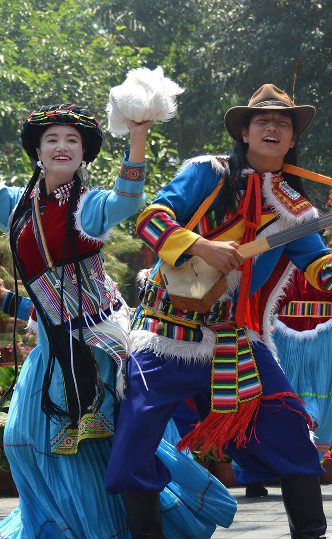 彝族在云南境內約471萬人,是省內人口最多、分布最廣的少數(shù)民族,主要聚居在金沙江、元江流域和哀牢山、無量山腹地。彝族是一個能歌善舞的民族,民間打歌、跳樂之風盛行,大三弦、跌腳舞久負盛名。火把節(jié)是彝族最具特色的民族節(jié)日。彝族村占地50余畝,三虎浮雕墻與虎頭內祖師形象表現(xiàn)了彝族虎鷹文化。太陽歷廣場圖騰柱上有太陽、虎、火和八卦圖形象,周圍環(huán)繞著10個朝向不同的月球造型,外圓周有12生肖石雕。依山而建的“...